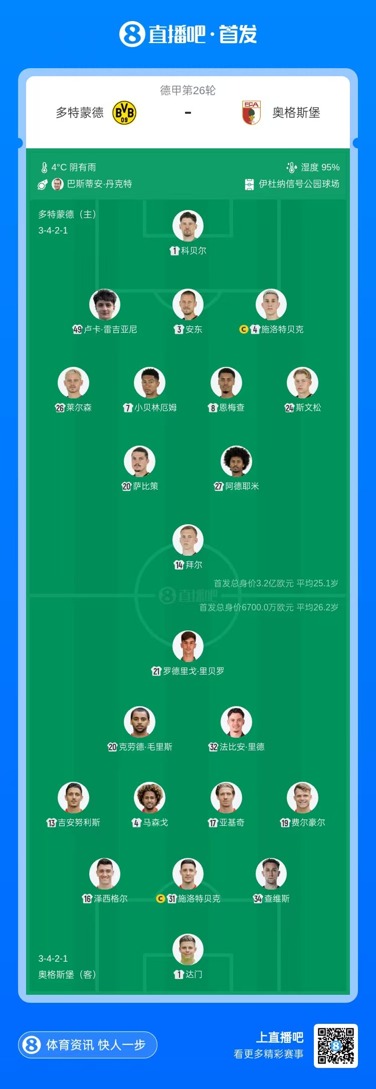 多特首发:1-科贝尔、3-安东、4-施洛特贝克、24-斯文松、26-莱尔森、49-雷吉亚尼、7-小贝林厄姆、8-恩梅查、20-萨比策、14-拜尔、27-阿德耶米