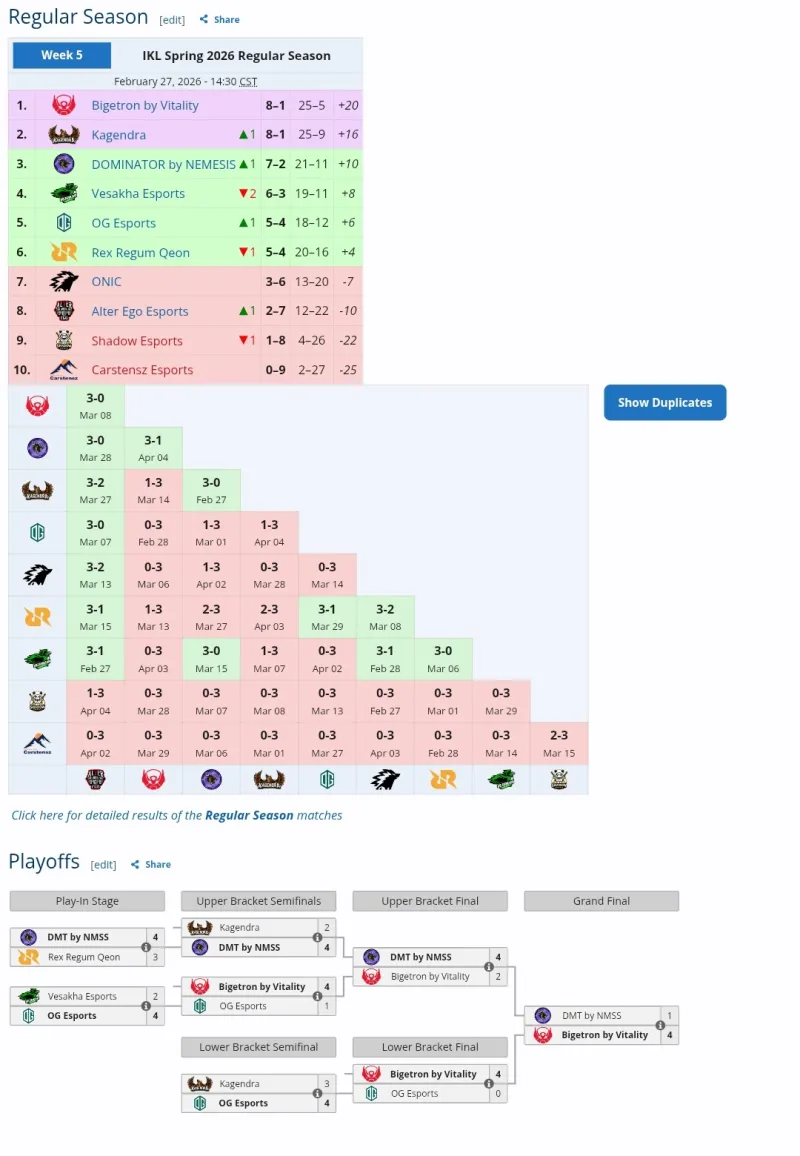 本届IKL联赛中,常规赛的格局与过往相差不大,BTR、DMT、KAGE等队作为传统强队仍然能排在联赛前列,进入季后赛的队伍正是此前都曾进入过世界赛的战队,而刚从KMW联赛退出转入到IKL的OG,在唯一留队的打野选手Daodao(前EDGM炸裂)的带领下也成功进入季后赛